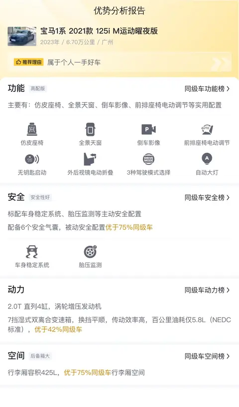 在二手车市场中,宝马1系2021款125i M运动曜夜版的市场行情价为11.62万-14.15万,而本车的报价仅为10.8万元,远低于市场行情价,这无疑增加了其竞争力。此外,本车是2021款中配车,根据当前车况,预计再行驶2年后,仍能以8.11万元的价格出售,保值率较高。