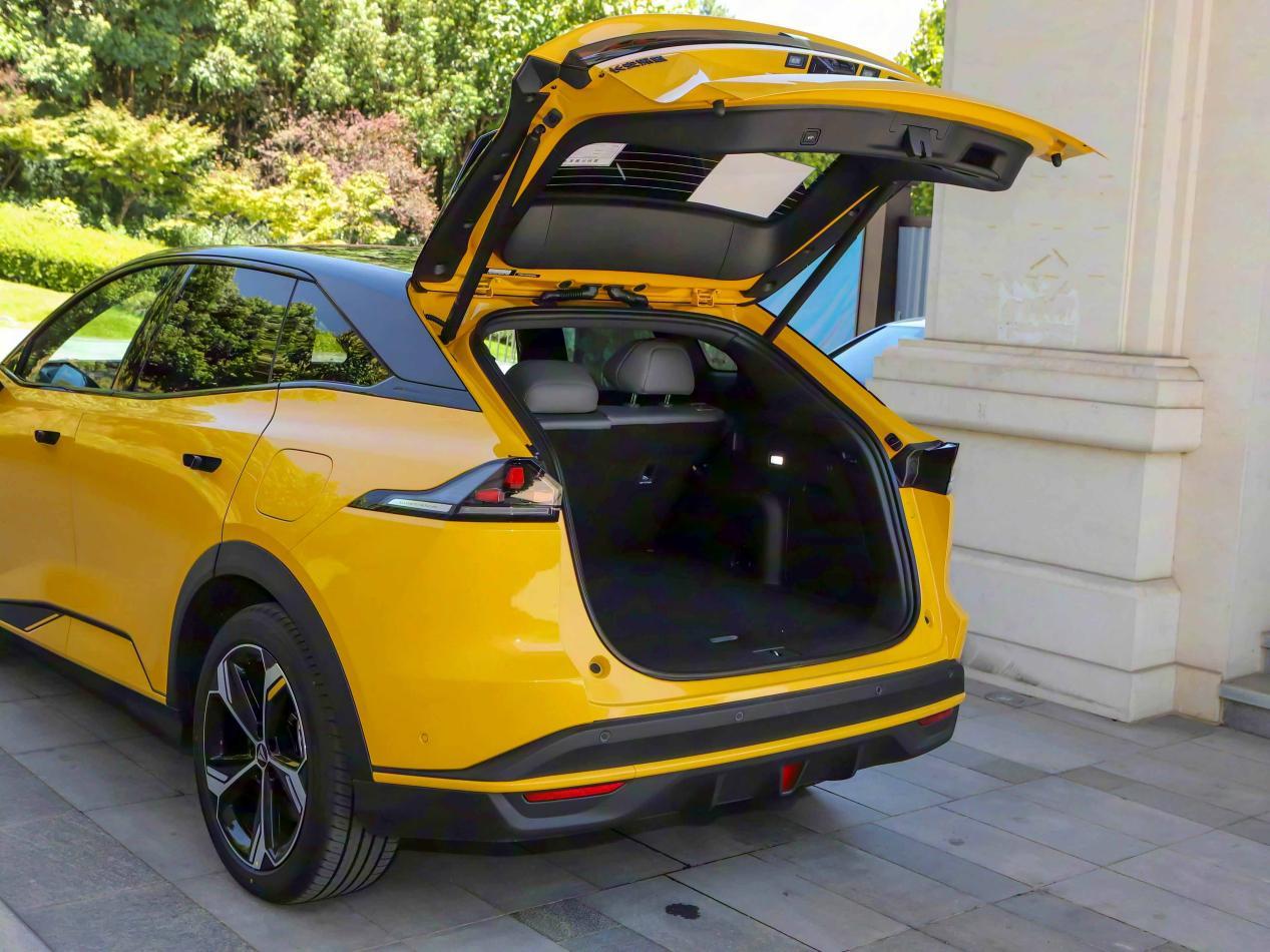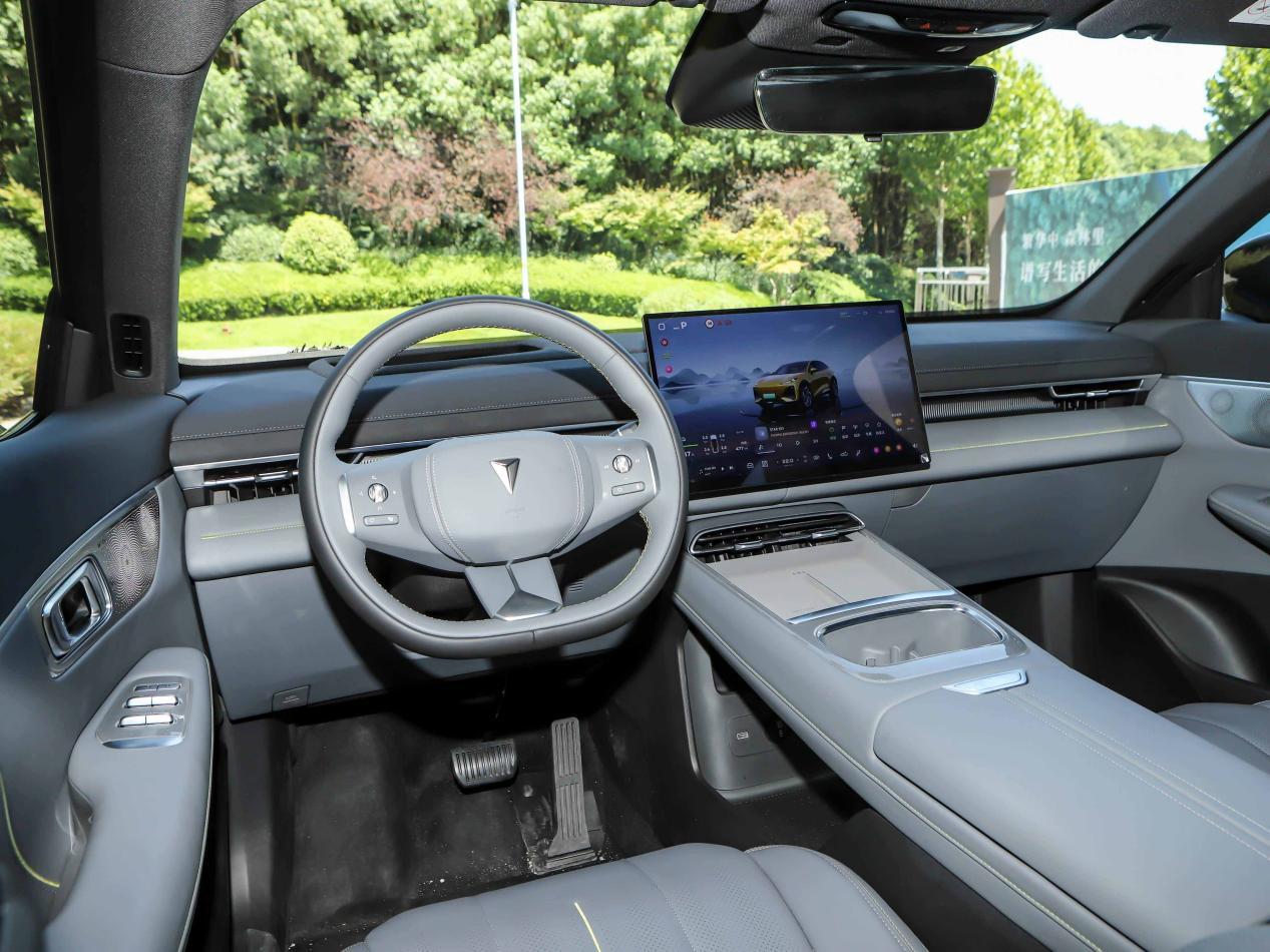 内饰依然是新能源车流行的简约设计风格,甚至方向盘前方取消了传统的仪表盘,不过,作为代替,这款车给配了一个55英寸的AR-HUD抬头显示,我之前实际体验过,有一说一,抬头显示的存在,其实仪表盘存在的意义确实不大。