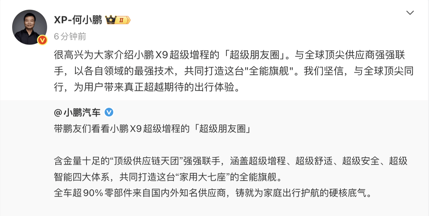 凤凰网科技讯 11月6日,小鹏X9超级增程今日19:00将开启预售。发布会开始前,小鹏汽车官方发文介绍,小鹏X9超级增程全车超90%零部件来自国内外知名供应商。