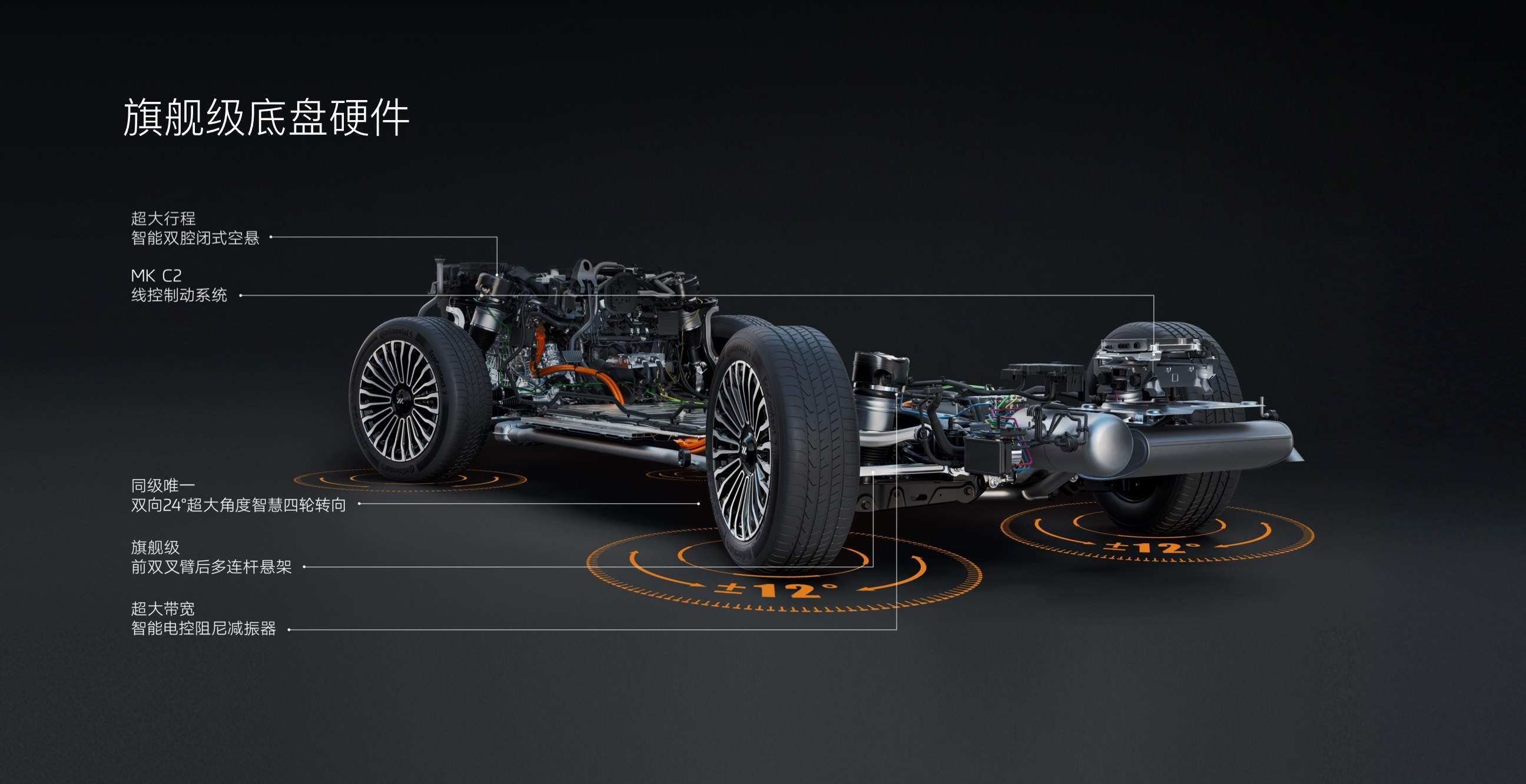 作为一款大型SUV,智己LS9的尺寸数据突出,其长宽高分别为5279/2000/1806毫米,轴距达到了3160毫米。为匹配其尺寸,新车在底盘配置上全系标配了“灵蜥数字底盘3.0”,核心技术包括150毫米行程的闭式双腔空气悬架,以及支持双向24度的四轮转向系统,同时支持蟹行模式2.0和主动防侧倾3.0等功能。