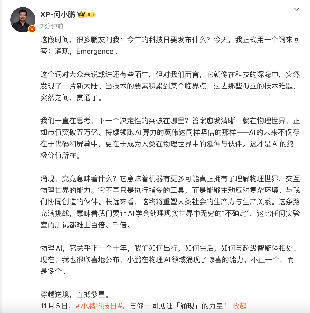 据了解,2025小鹏科技日将于11月5日15:30在广州举行。今年的科技日要发布什么?何小鹏发文称,用一个词来回答:涌现,Emergence。何小鹏表示,下一个决定性的突破就在物理世界。正如市值突破五万亿、持续领跑AI算力的英伟达同样坚信的那样――AI的未来不仅存在于代码和屏幕中,更在于成为人类在物理世界中的延伸与伙伴。这才是AI的终极价值所在。何小鹏还宣布,小鹏在物理AI领域涌现了惊喜的能力。