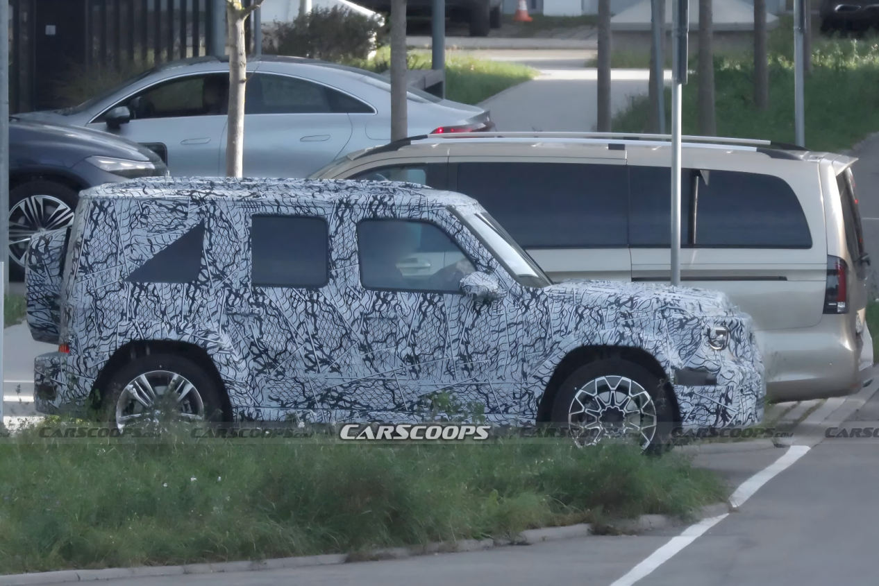 通过部分谍照可以看到,相比起其旁边拥有1.9米高的奔驰V级,这款小G的体型明显更小;相比EQS SUV,高度差就更加明显了。