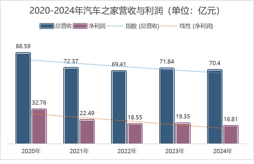 2024年,汽车之家的收入降至70.4亿元,净利润也缩减至16.81亿元。