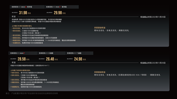 中国经济网11月7日讯(记者 郭涛)昨日,全新坦克400正式上市,推出Hi4-Z智享版、Hi4-T智享版、Hi4-T,以及柴油版和汽油版共5款车型,建议零售价为24.98万至31.98万元。